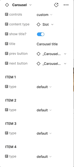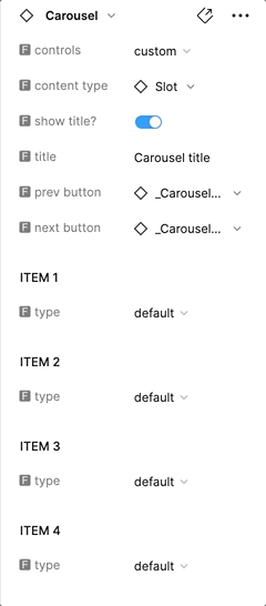 WPDS Carousel takes advantage of component properties, a native feature in Figma. With component properties or ‘props’, we can build components that are flexible enough to configure according to your needs, while preserving reusability. A further benefit of this approach is that we can establish a direct relationship between the design component that lives in Figma and the coded component that lives in the browser, because they share the same properties. (Learn more about “connected components” in our Zeplin resource guide).